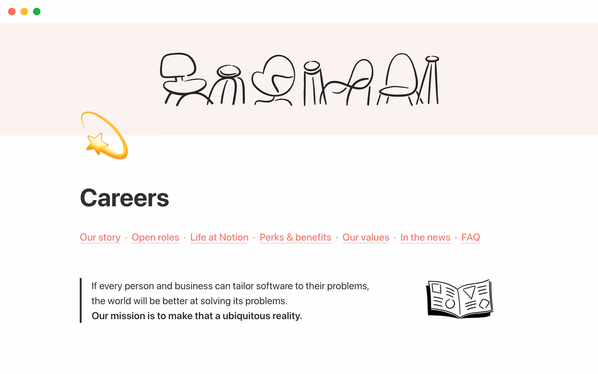 Even though we had lots of different content to include — Youtube videos, Greenhouse links, press articles — we were able to host it all on Notion, and avoided spending hours and dollars on a custom landing page.