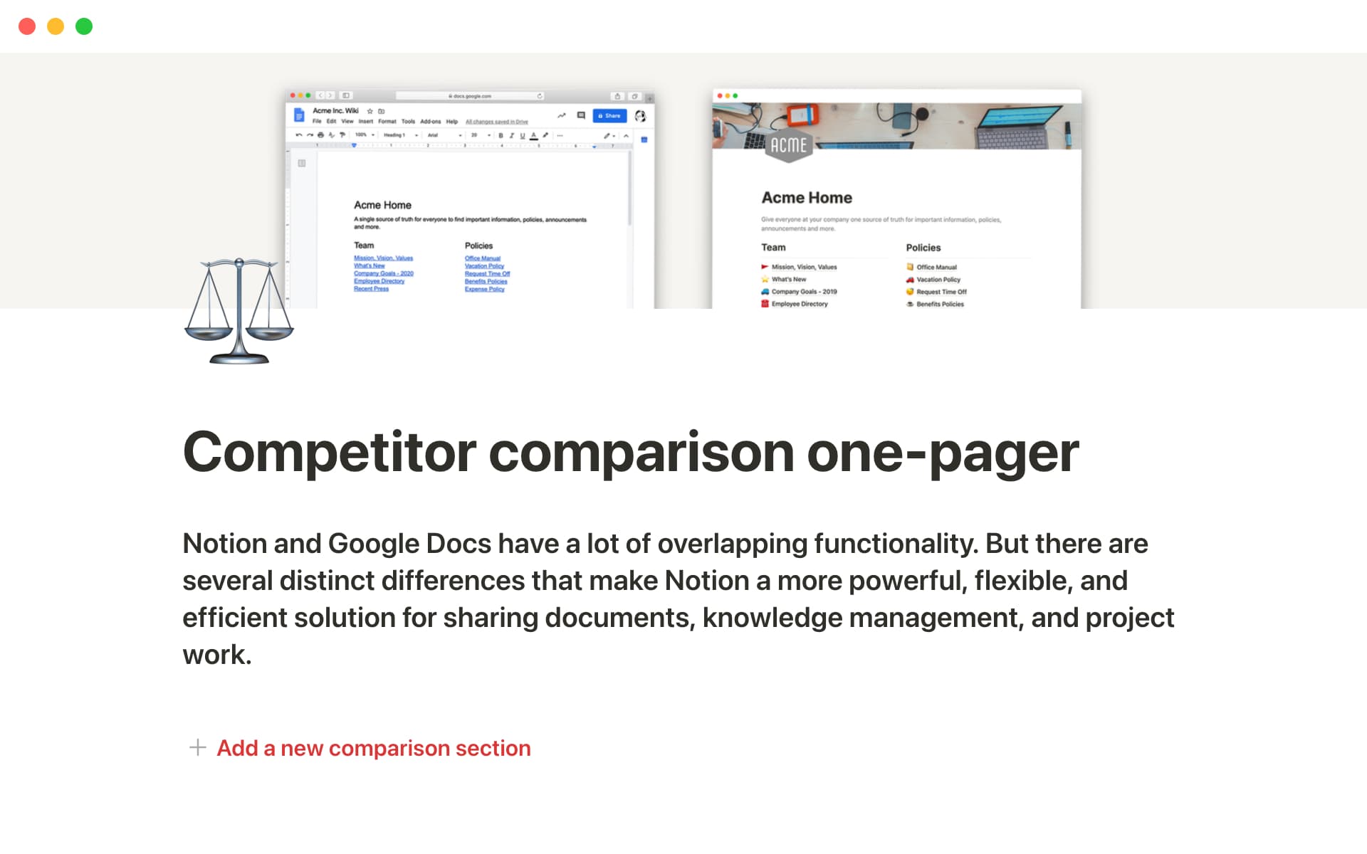 Below, we included one template for competitor comparisons, and one where you can give an overview of your services, tiers, or packages.