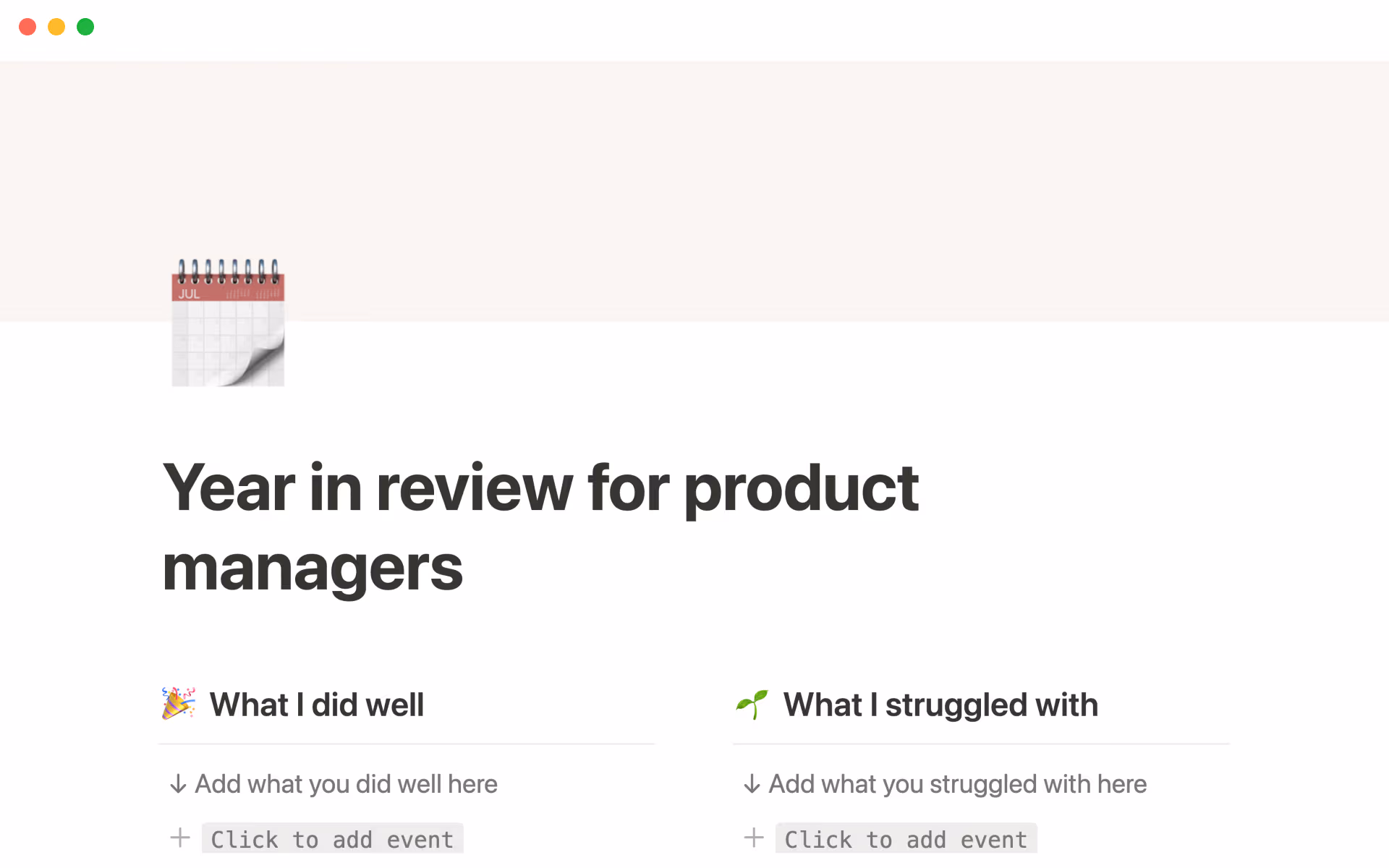 Retrospectives and OKRs are often used to gauge a product's success, so why not use the same system for yourself? This template from Product School helps you quickly see what worked and what didn't, and how to create an upgraded plan of action for the coming year. Just like with a team's OKRs, you can use the connected databases for your own objectives and key results and see your progress bars filling up as you reach your targets.